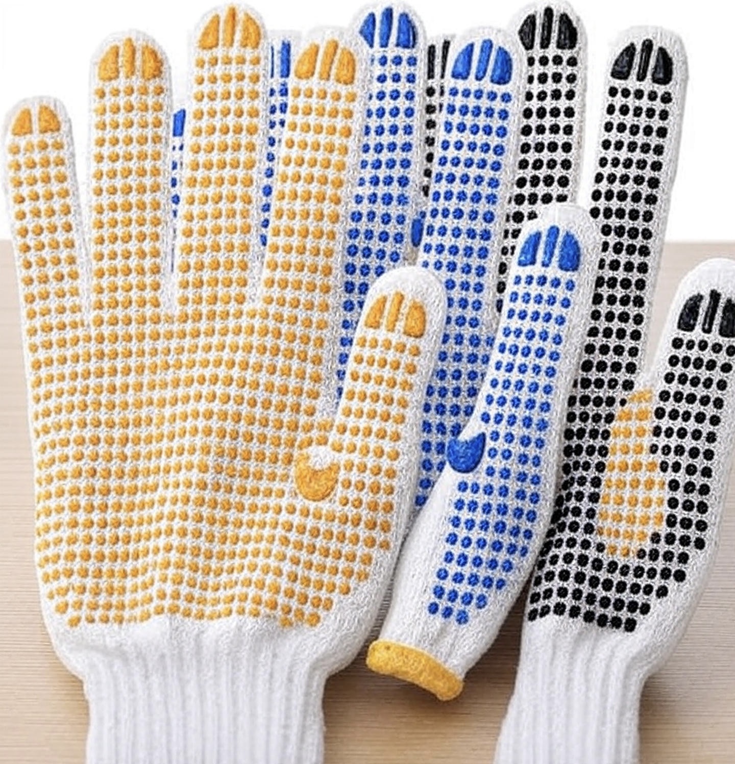 DOTTED GLOVES  combine high quality blended knit gloves with a PVC coating in dotted or criss-cross patterns that provide a better grip for material handling tasks. jersey, canvas, nylon, and cotton/polyester string knit gloves are all available with these added grip features.