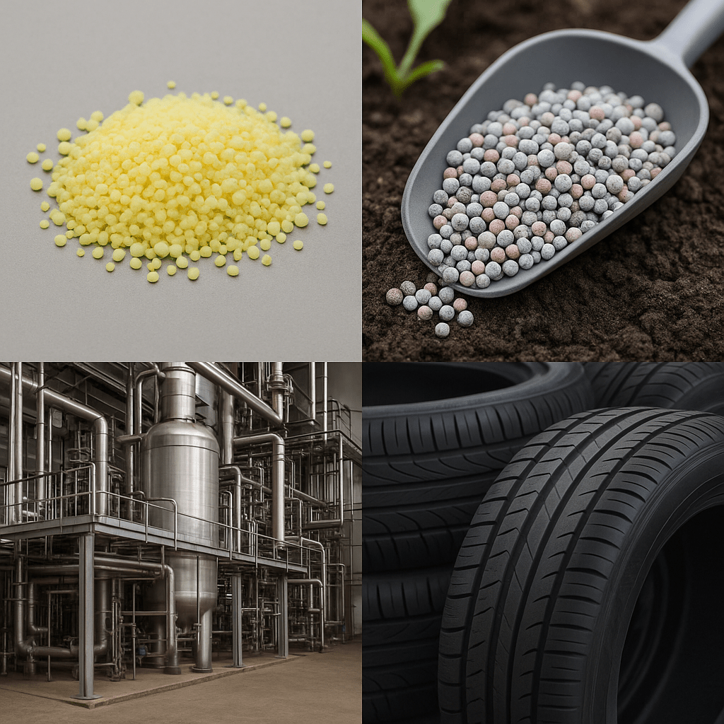 Sulfur is one of the most important agricultural and industrial raw materials and is considered a strategic product and elemental sulphur is obtained as a co-product recovered from oil and gas production in sweetening process. The greatest commercial use of the element is the production of sulfuric acid for sulfate and phosphate fertilizers, and other chemical processes. Sulphur is the primary source in the production of sulphuric acid, the world’s most widely used chemical. Sulfur reacts directly with methane to give carbon disulfide, used to manufacture cellophane and rayon. One of the direct uses of sulfur is in vulcanization of rubber, where polysulfide chains crosslink organic polymers.