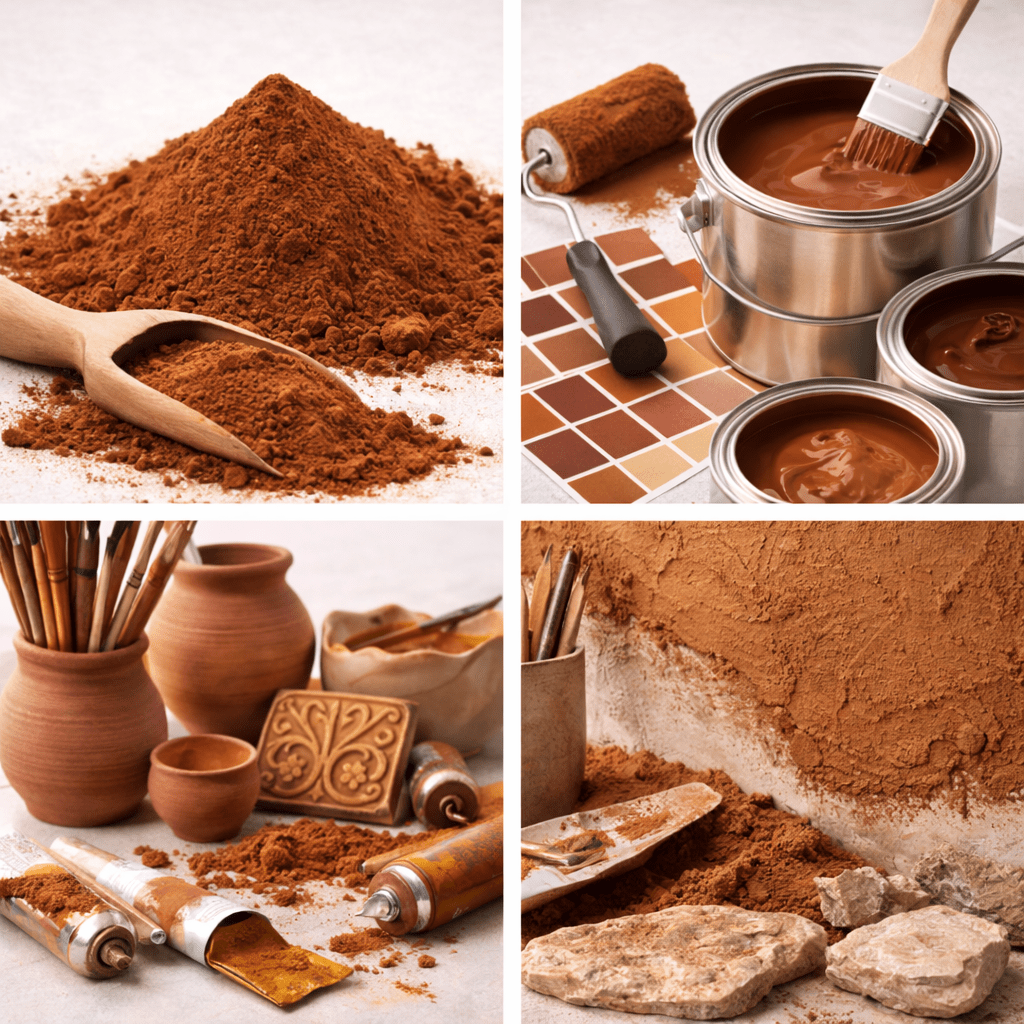 Brown ochre powder is widely used in architectural and industrial paints, cement and concrete coloring, plasters, mortars, tiles, bricks, ceramics, asphalt, rubber compounds, plastics, and decorative coatings. Its natural origin and chemical stability make it especially suitable for exterior surfaces and applications exposed to sunlight, moisture, and alkaline environments.