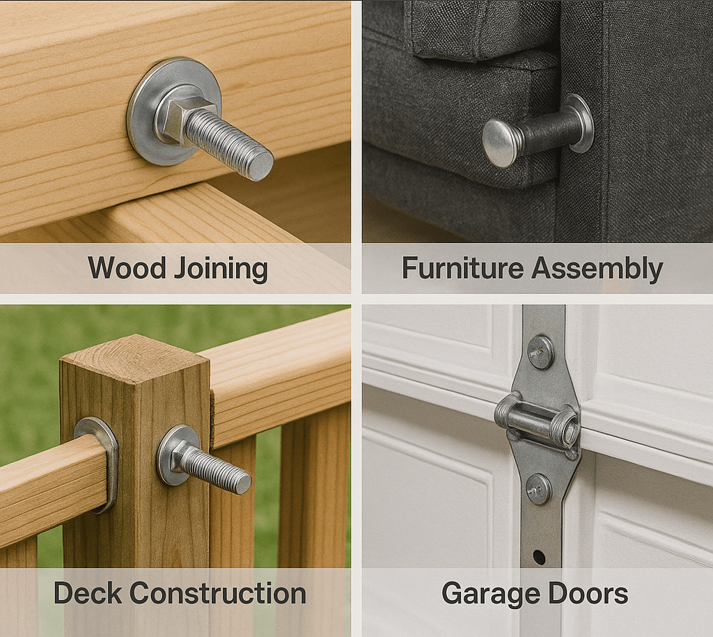 This design allows for single-side installation, as the square neck prevents the bolt from turning when a nut is tightened on the other side. They are primarily used in woodworking and metalworking applications to join materials like wood to wood, wood to metal, or metal to metal.
