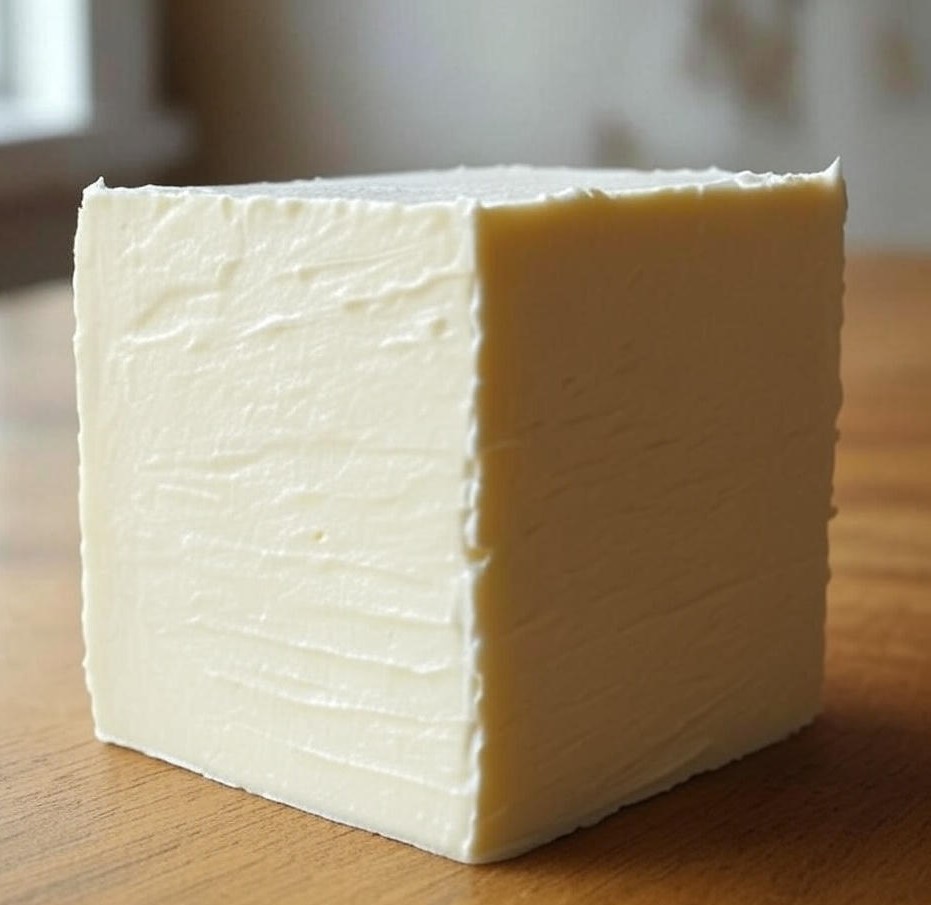 Cream Cheese is made by adding cream to milk. It comes in a block, sometimes with added flavors, and spreads smoothly. The flavor is light and slightly tangy. Its white , soft and smooth
