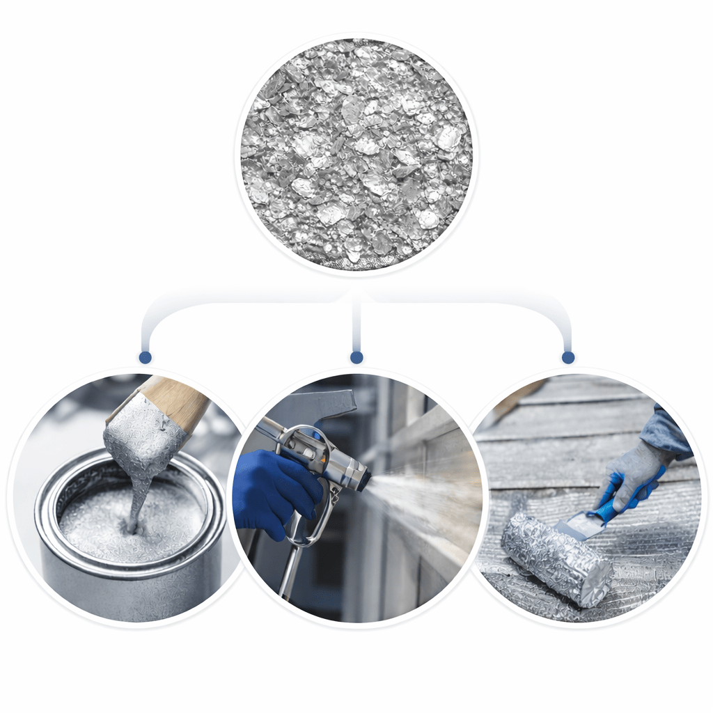 With its bright silver appearance and excellent coverage, flake aluminum powder is a preferred choice for manufacturers seeking both functional protection and decorative metallic effects. Flake aluminum powder is available in leafing and non-leafing grades, with different particle size distributions (fine, medium, and coarse flakes) to suit various formulations. Typical aluminum content ranges from 98.0% to 99.7% Al, with surface treatments such as stearic acid or oleic acid to improve dispersion and stability. Key applications include metallic paints and inks, anti-corrosion and marine coatings, roof and heat-reflective coatings, industrial primers, and protective coatings for steel structures, pipelines, and storage tanks. Thanks to its lamellar structure, flake aluminum powder provides excellent UV resistance, moisture barrier properties, and thermal reflectivity, making it suitable for both indoor and outdoor use.