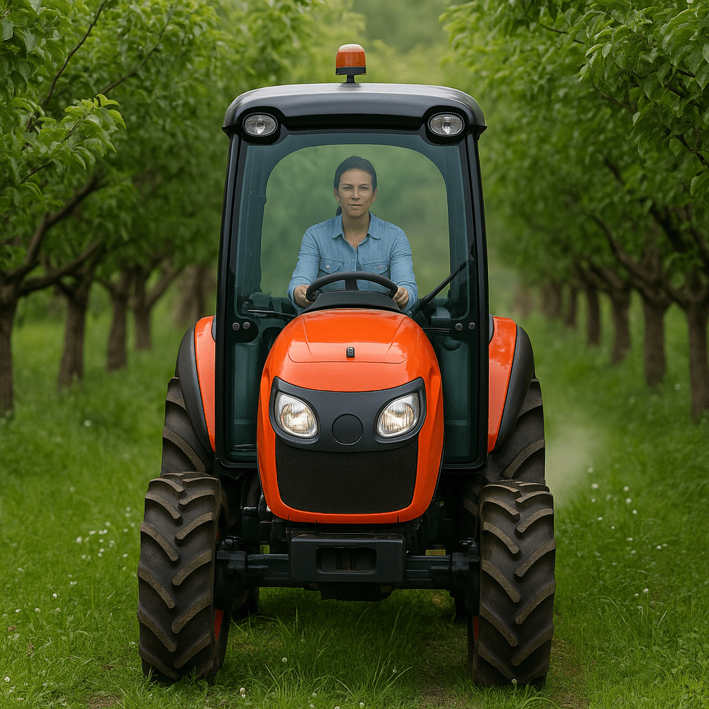 Orchard tractors are made for orchards, vineyards, and special crop farms. They are small and easy to move. They go between rows of trees or vines. Plus, they have small cabs.