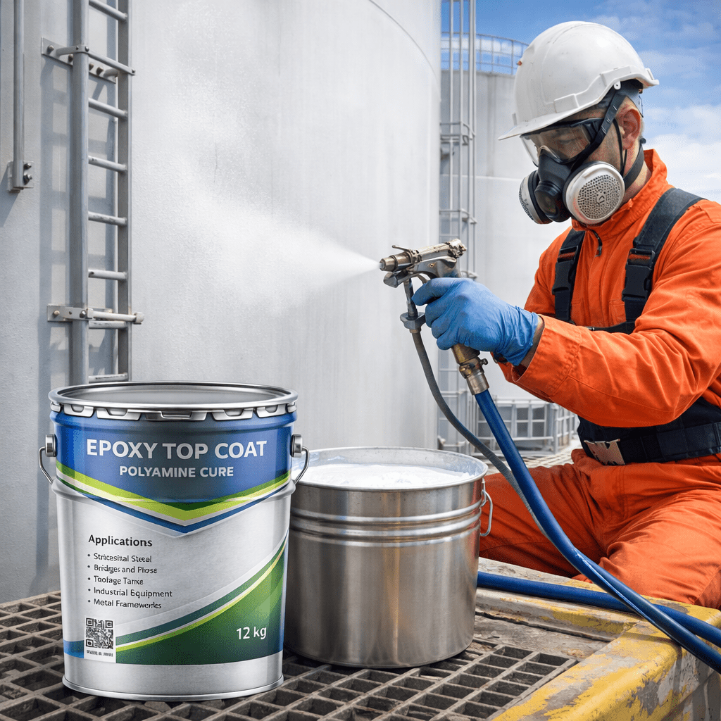 Polyamine cure epoxy topcoats are available in standard build, high-build, chemical-resistant, and water-resistant grades, depending on service conditions. They are commonly applied on structural steel, storage tanks, pipelines, industrial equipment, offshore and marine structures, power plants, and concrete floors. Typical specifications include high adhesion strength, good hardness development, resistance to water, oils, fuels, and many chemicals, and suitability for application in ambient and low-temperature conditions. These coatings can be applied by airless spray, roller, or brush and are fully compatible with epoxy primers and epoxy or polyurethane interlayers.