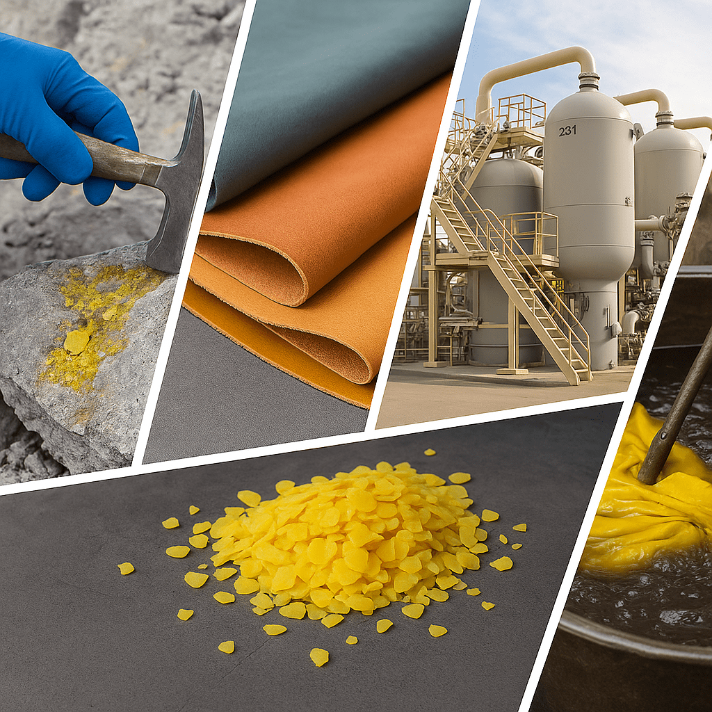 • It’s used to make elastomeric synthetic materials, sulphur colours, and other things.