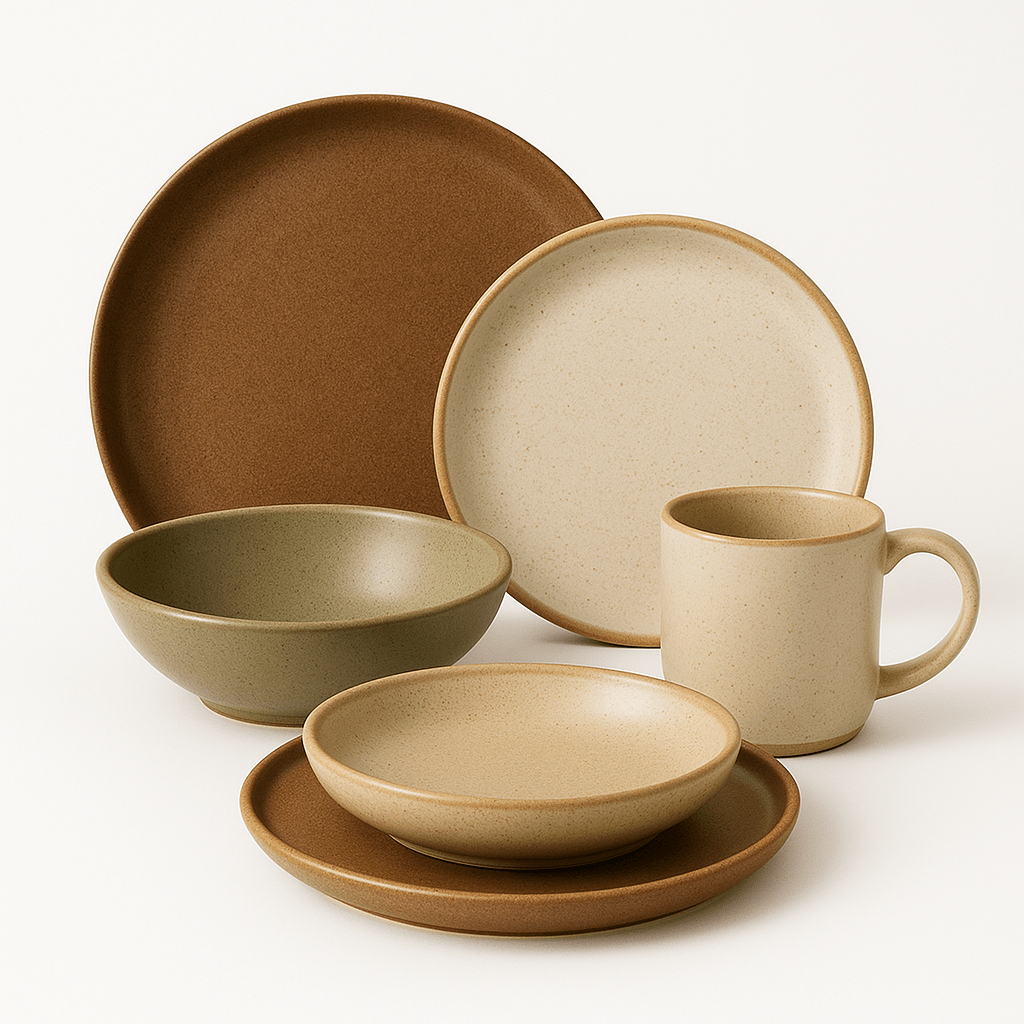 Stoneware is a step up in price and durability compared to earthenware. It’s made from clay, which is fired at 1200℃, achieving a partially vitrified product that results in a more durable, denser dish that’s stone-like in appearance and texture. Because it’s partially vitrified, stoneware has a better porosity level than earthenware and doesn’t require glazing to be appropriately moisture resistant. Because of its durability, stoneware is easy to maintain. It offers better scratch and chip resistance and may be microwave and dishwasher safe. It’s a fantastic option for families thanks to its durability and lower price point. And, similar to earthenware, it boasts a rustic charm.