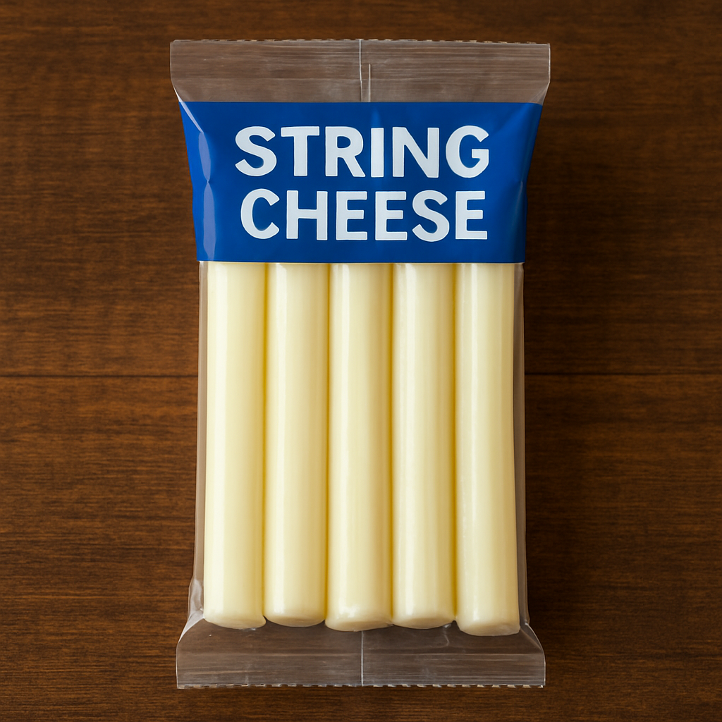 Traditionally, String Cheese is a type of mozzarella made into small logs that can be pulled apart as strings. It comes in a variety of flavors and is often a staple of a good school lunch.