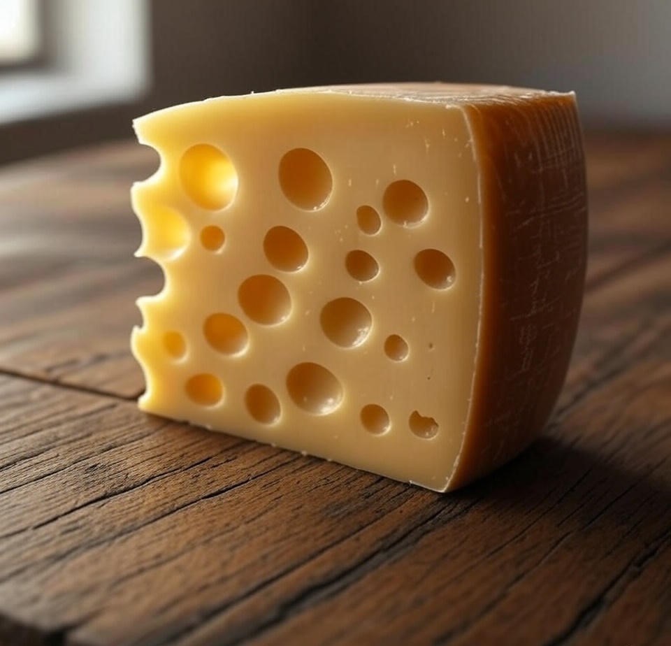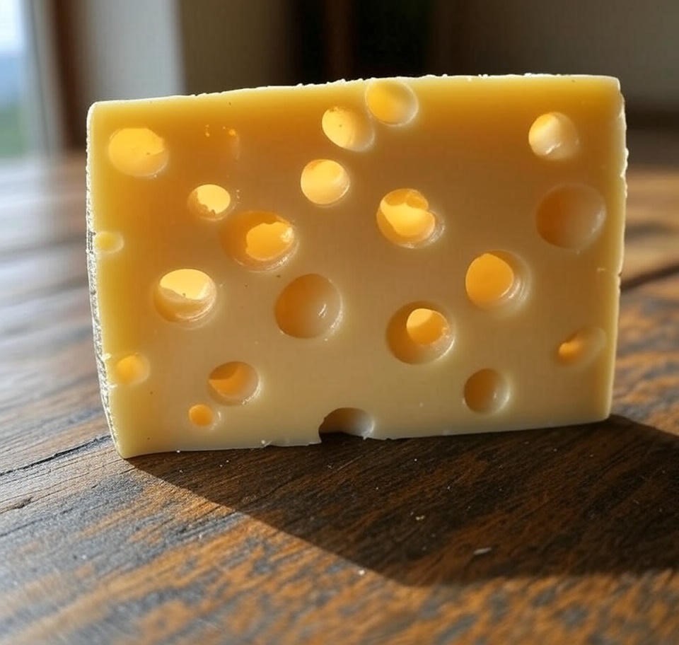Swiss cheese  is characterized by its shiny, pale yellow color and a firmer texture. The flavor is mild, sweet, and nutty, with a savory but not sharp taste. Swiss cheese may have distinctive holes, known as ‘eyes’.