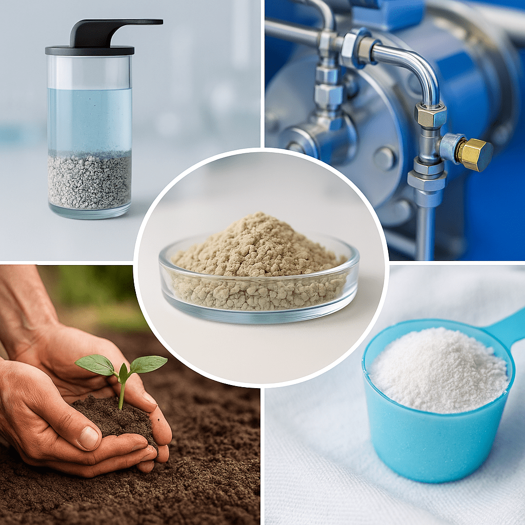 There are several types of Zeolite, including Natural Zeolite (Clinoptilolite) and Synthetic Zeolite varieties such as Zeolite A, Zeolite X, and Zeolite Y, each optimized for specific applications. Natural Zeolite is widely used in water and wastewater purification, gas adsorption, soil improvement, and animal feed additives, while Synthetic Zeolites serve in detergent manufacturing, petrochemical refining, and catalytic cracking. Production involves mining, crushing, and refining natural deposits, or synthesizing through controlled hydrothermal crystallization of alumina and silica under specific temperature and pH conditions. The result is a uniform, high-purity product with tailored pore size and ion-exchange capacity.